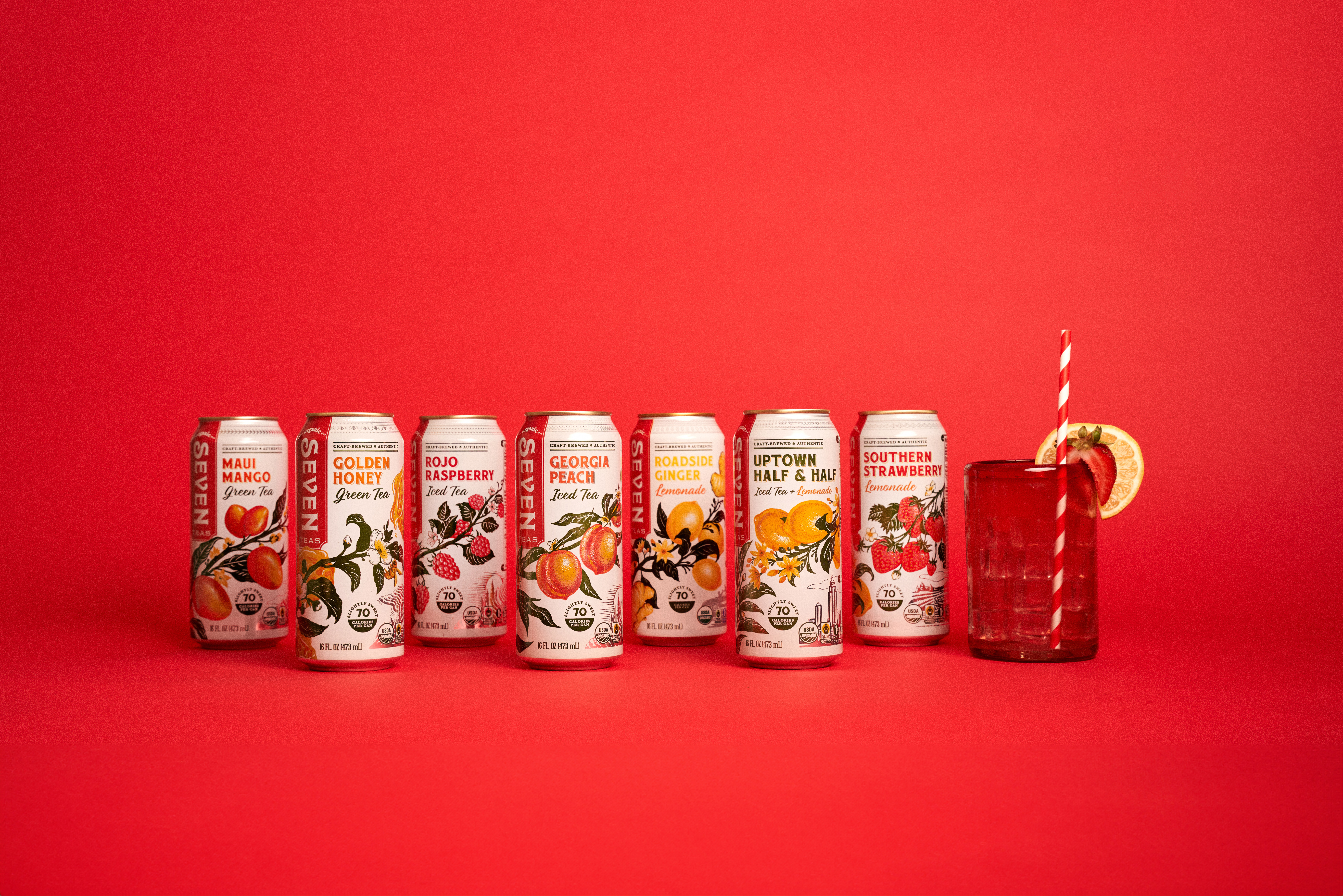 Designed with an asymmetrical illustration forging its way through the center of the can, each flavor of tea creates a sense of place through a unique illustration—created by the aluminum of the can showing through for a metallic finish—and decorative edges and borders inspired by the region or city. Stay tuned for a full case study on these details.
